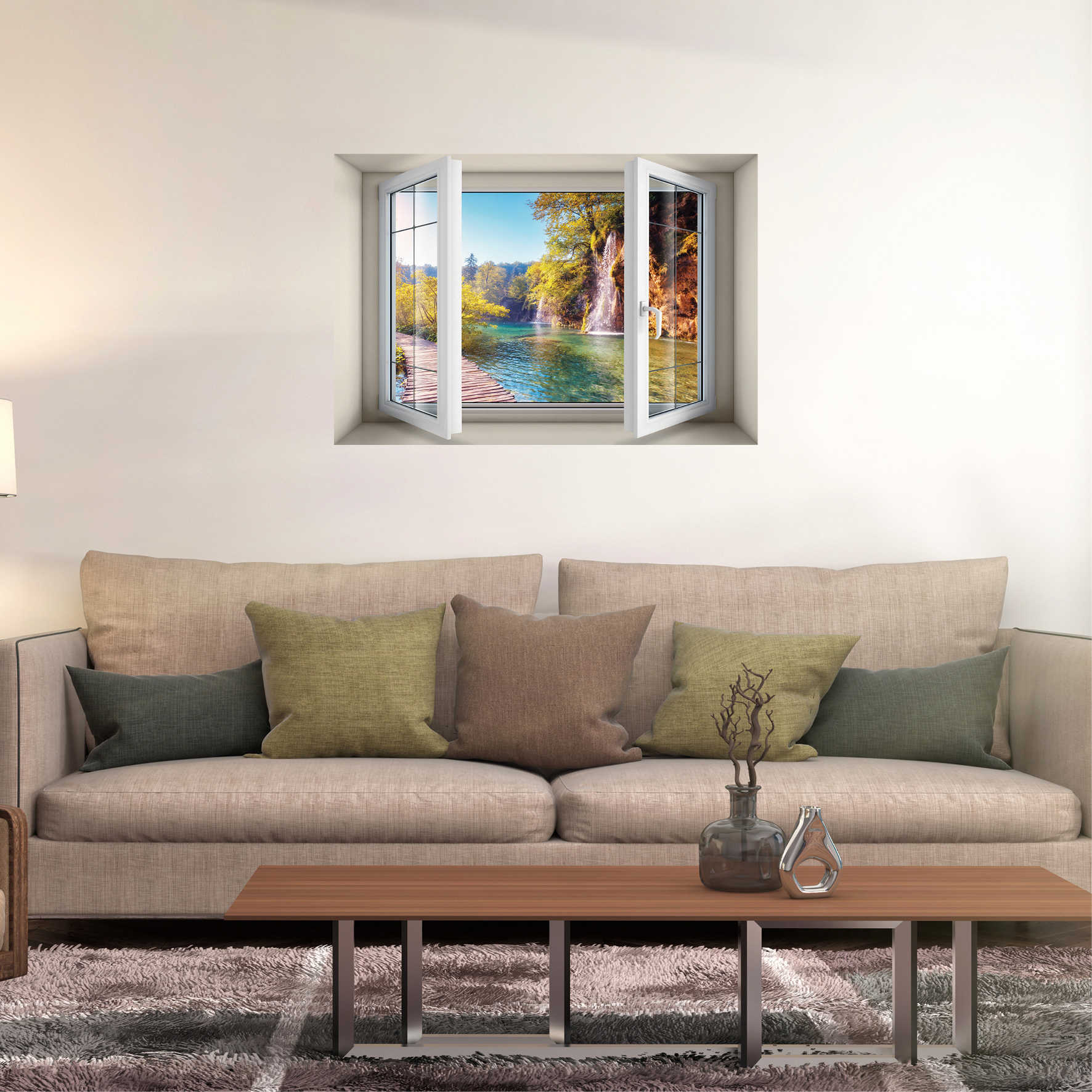 מדבקת קיר בגודל 50 על 70 ס''מ המדמה חלון בתוך נישה עם נוף משתקף של מפלים שוצפים