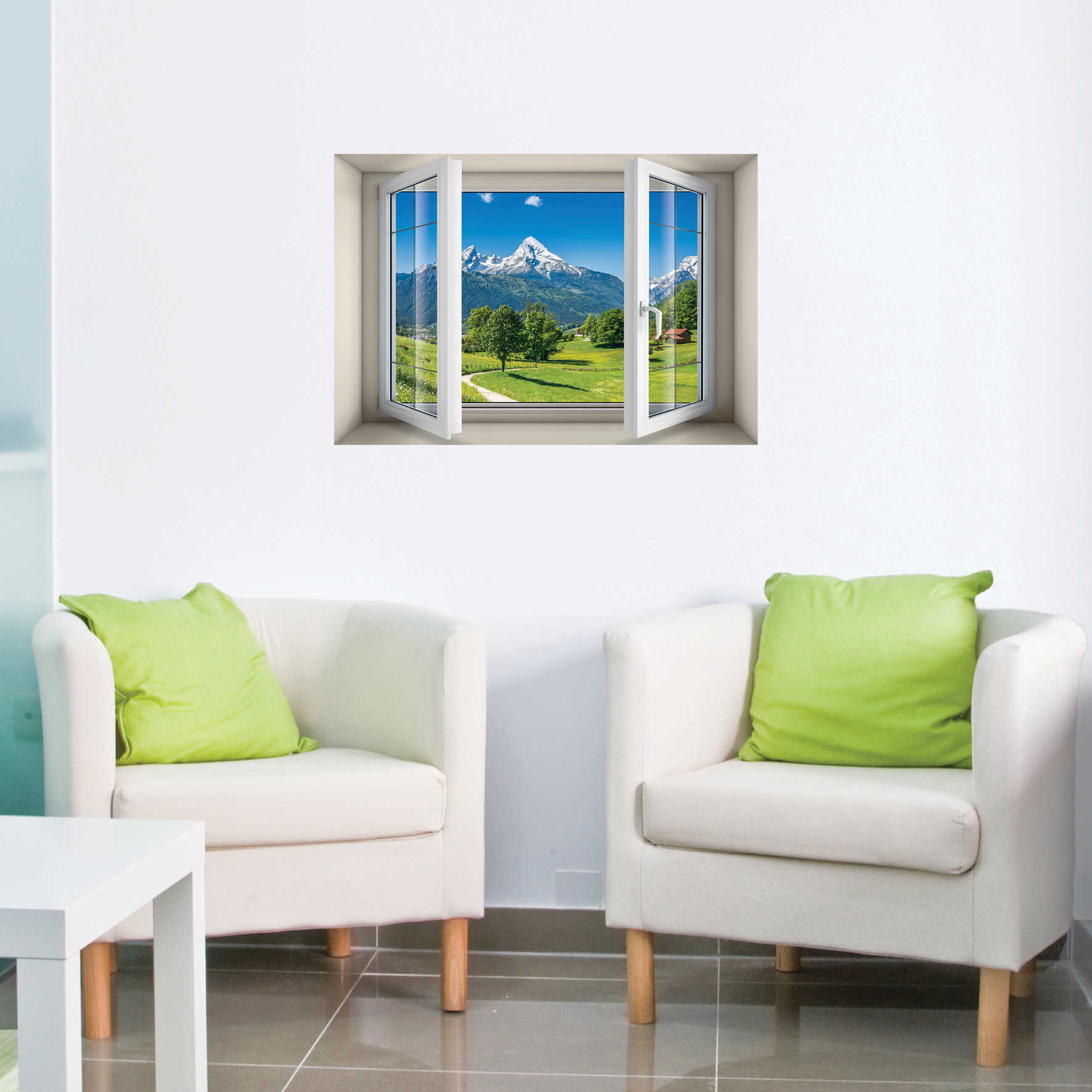 מדבקת קיר בגודל 50 על 70 ס''מ המדמה חלון בתוך נישה עם נוף משתקף לעמק ירוק בשוויץ.