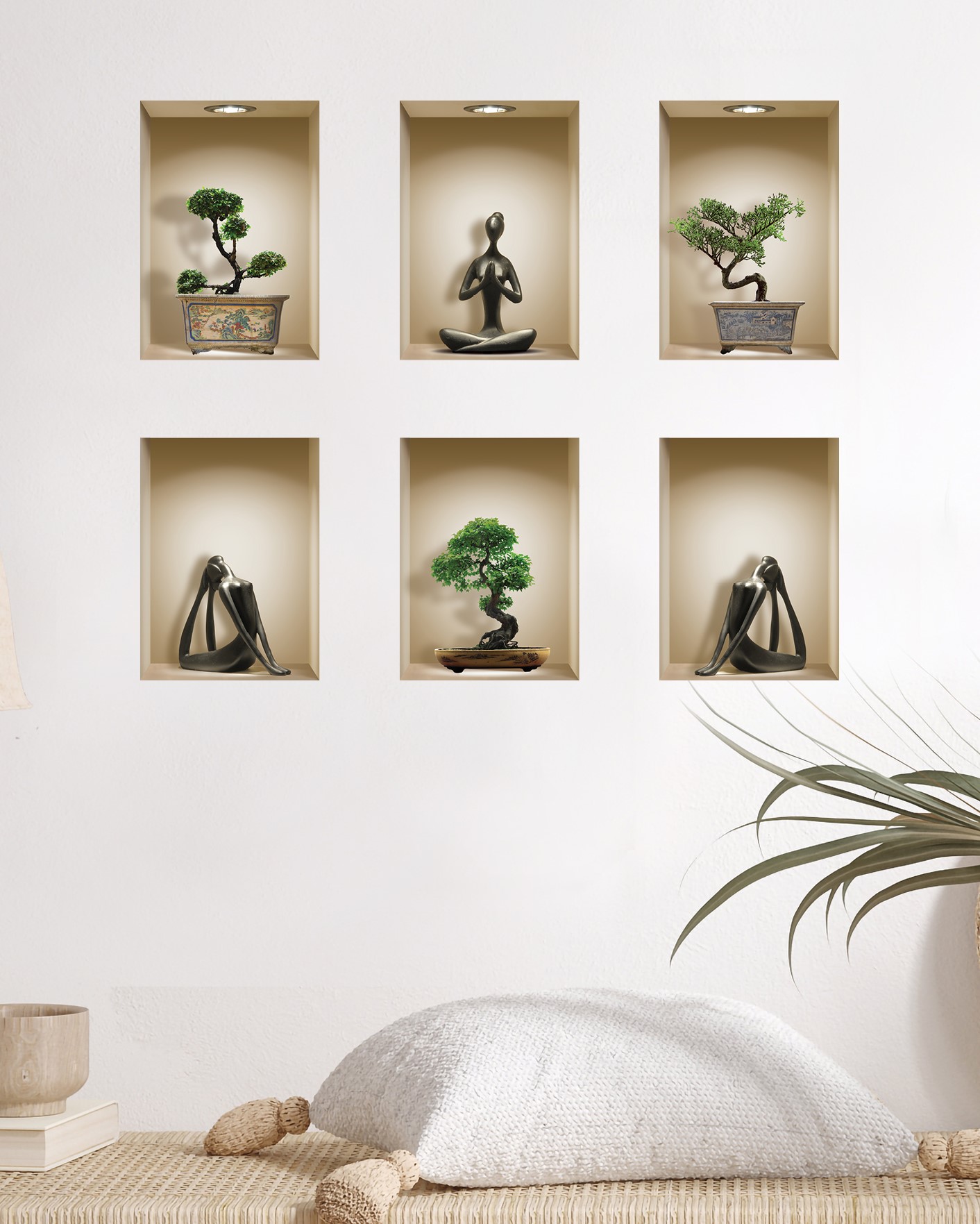 שישיית מדבקות נישה כוורת פסלים שחורים ועציצי בונסאי בגודל 24 על 34 ס''מ כל אחת וביחד הן 80 על 90 ס''מ.