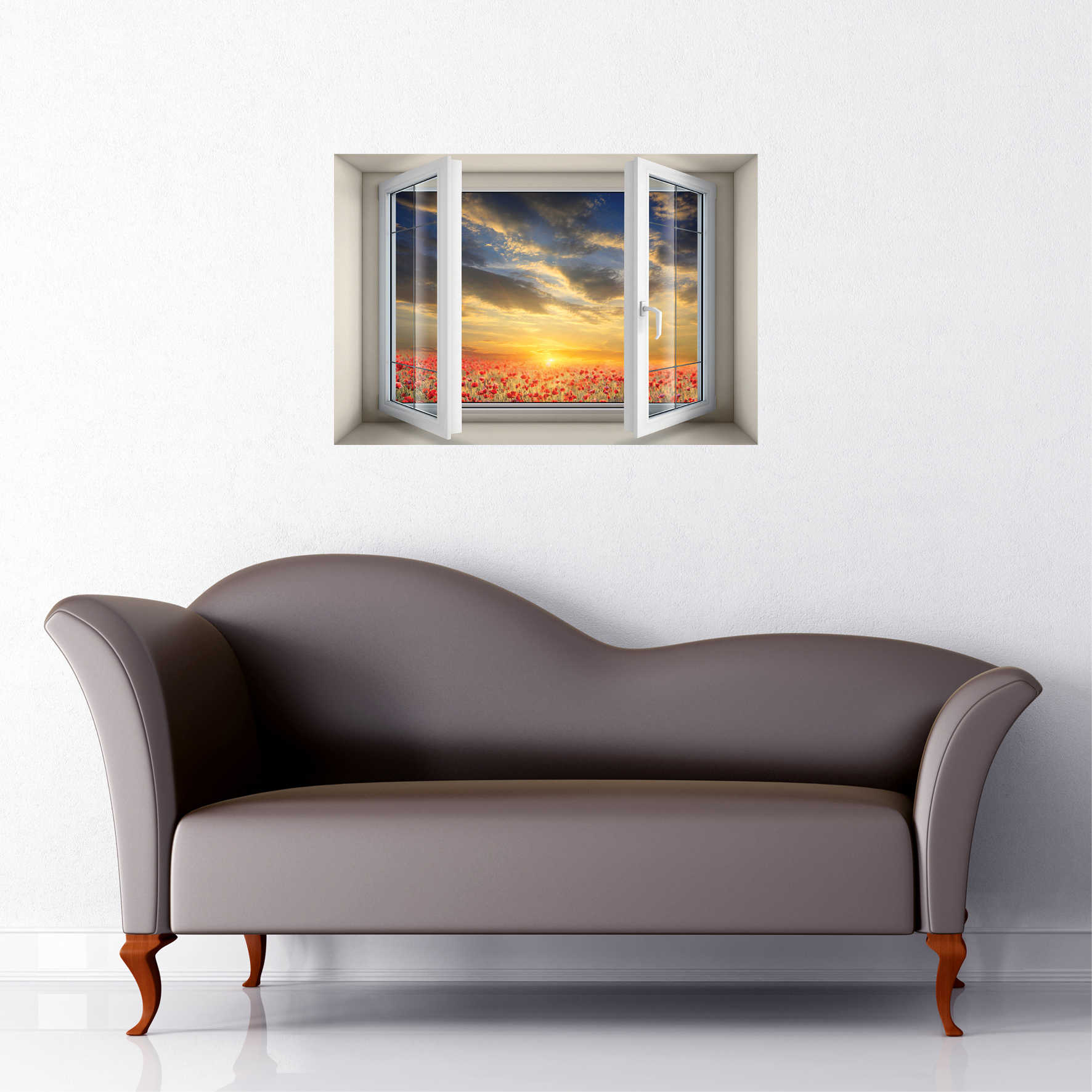 מדבקת קיר בגודל 50 על 70 ס''מ המדמה חלון בתוך נישה עם נוף משתקף
